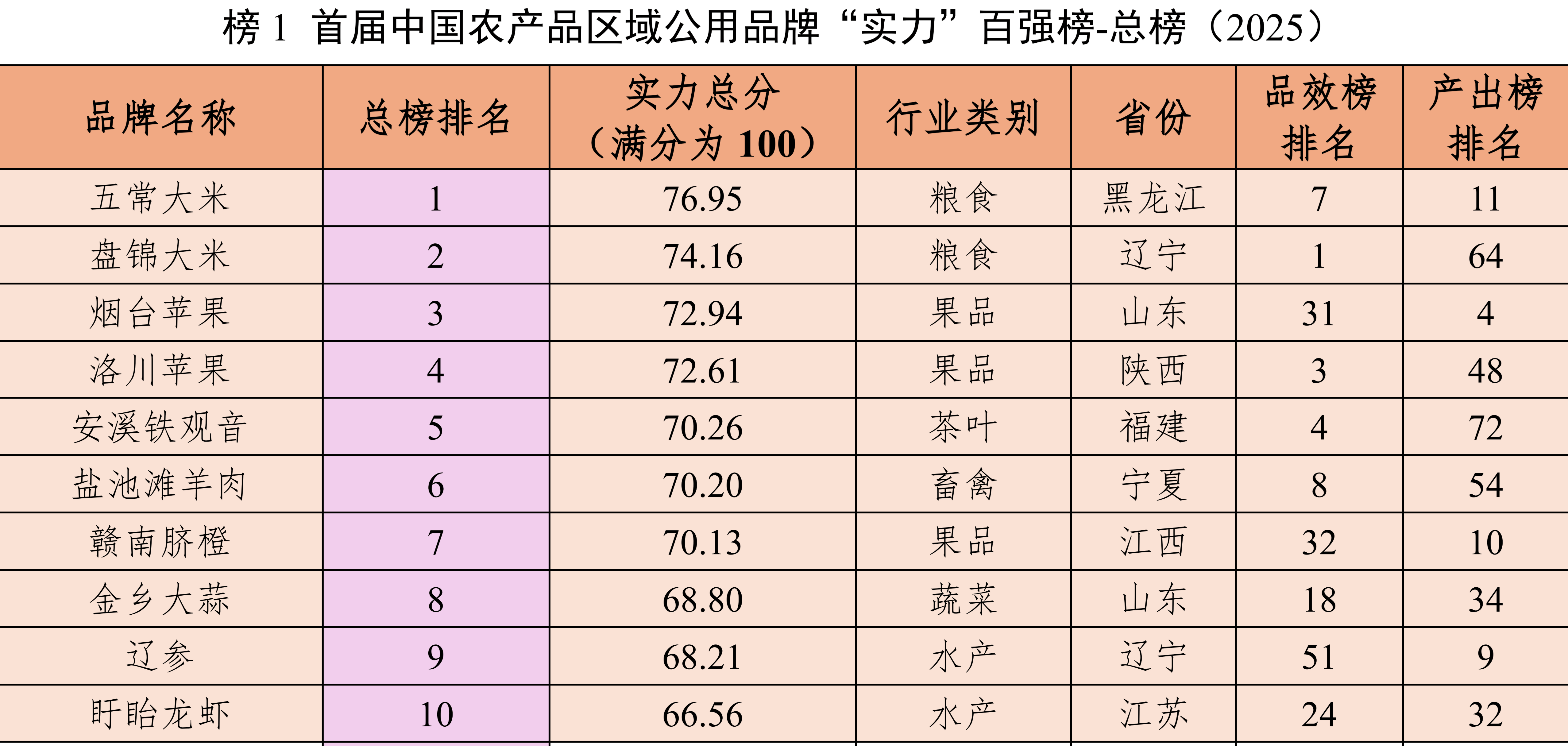 区域分布上,山东、河南、内蒙古各有8个品牌进入总榜百强,并列区域第一;甘肃以7个品牌紧随其后,江苏、江西、陕西、新疆各有5个品牌入围。总榜排名中,京津冀地区,北京前三为北京鸭、平谷大桃、大兴西瓜;天津前三为津南小站稻、杨家泊对虾、沙窝萝卜;河北前三为大名小磨香油、平泉香菇、围场马铃薯。长三角地区,上海前三为崇明大米、松江大米、崇明白山羊;江苏前三为盱眙龙虾、南京盐水鸭、射阳大米;浙江前三为安吉白茶、三门青蟹、西湖龙井;安徽前三为霍山石斛、六安瓜片、长丰草莓。