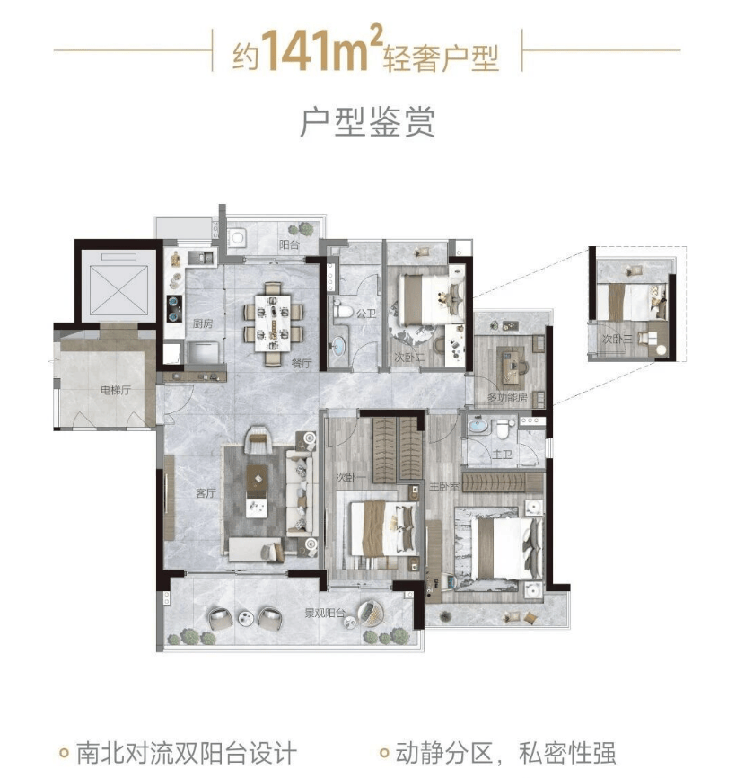 “双主套”布局是这款户型的最大特色。两个主卧均配备了独立卫浴和衣帽间,既照顾了主人的隐私,又方便了老人或客人的居住,完美解决了三代同堂家庭的痛点。客厅开间达到了惊人的5.9米,连接着一个8.3米的超长观景阳台,直面壮丽的山景与精致的园林,气势磅礴,尽显豪门风范。此外,户型还预留了独立的家政间和储物间,充分解决了大户型的收纳难题,让家始终保持整洁有序。全屋精装标准进一步升级,配备了双层中空隔音玻璃,有效隔绝外界噪音;安装了全屋净水系统,保障家人的饮水健康。总价约659万起,就能拥有这样一套集舒适、奢华、科技于一身的传世大宅,无疑是身份与品味的象征。