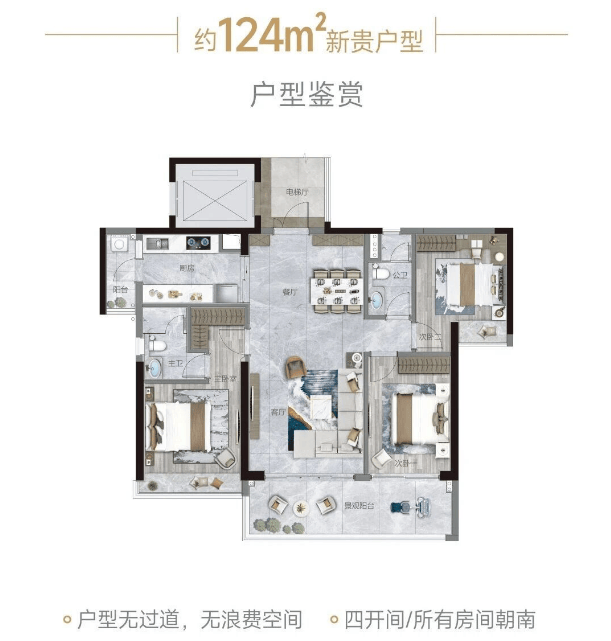 “四开间朝南”是这款户型最大的亮点。客厅和三个卧室全部朝南,带来了超过10米的超大采光面,让阳光洒满房间的每一个角落。餐客厅一体化设计,连接着一个6.7米的南向观景阳台,直面社区中心园林,视野开阔,景色宜人。在这里,您可以一边品茶一边欣赏四季变换的美景,感受生活的美好。主卧采用了套房设计,配备了独立卫浴和步入式衣帽间,为主人提供了私密舒适的尊贵体验。两个次卧的面积均超过了9㎡,空间宽敞,可以根据需要灵活打造为儿童房、书房或者客房。动静分区的布局科学合理,休息区与活动区互不干扰,完美贴合三口之家的居住习惯。总价约446万起,就能在黄埔主城拥有这样一套高品质的现房三房,性价比之高,令人咋舌。