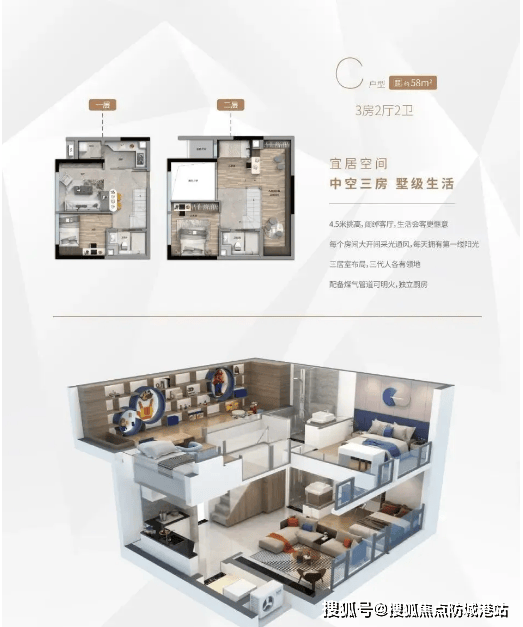 建面约58㎡户型堪称“全广州最贴心的户型”,4.5米层高,3.1米开间阔绰客厅,规划为三房布局,无暗房设计,采光通风俱佳,同时配备独立阳台,提升居住舒适度。最值得关注的是,该户型配备燃气管道,可明火烹饪,打造独立厨房,享受居家烟火气息,厨房开放式设计,连通观景阳台,进一步提升空间通透性。三房布局可满足三代同堂居住,一楼规划长辈房,便利舒适,二楼规划儿童房与功能房,充分给予孩子探索的空间,兼顾实用性与舒适度,适合改善型自住人群。