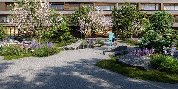 依托CCRC模式打造的大家的家北京朝阳城心社区,总体规模约3万平米,毗邻四环内最大的城市公园——朝阳公园,周边武警总医院、朝阳医院等优质医疗资源环绕,既享有城市核心区的便捷配套,又坐拥自然生态的宜居环境,成为高端养老群体的优选之地。大家的家北京朝阳城心社区以“全龄段照料”为核心,融合餐饮、医疗、娱乐等多元功能空间,4000平米日式风格室外庭院更是点睛之笔,借鉴日式枯山水园林设计理念,搭配园林小品、健身器材、步行走道、露天凉椅等设施,绿植繁茂、景致清幽,长辈可在庭院中散步、休憩、观景、冥想,享受自然滋养,感受慢生活的惬意。